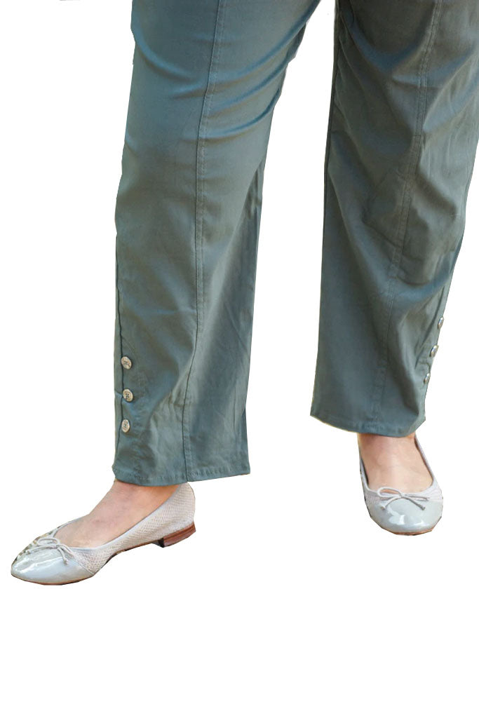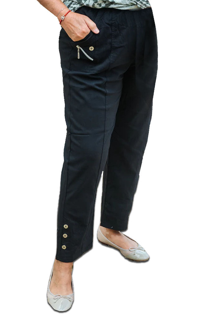 - Elastischer Bund, Reißverschlusstaschen und Knopfdetails an der Wade
