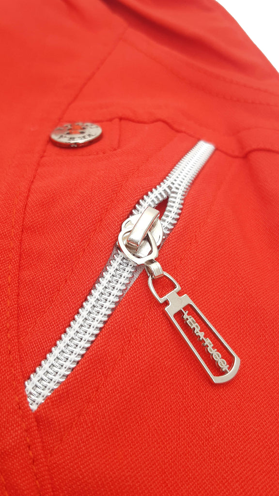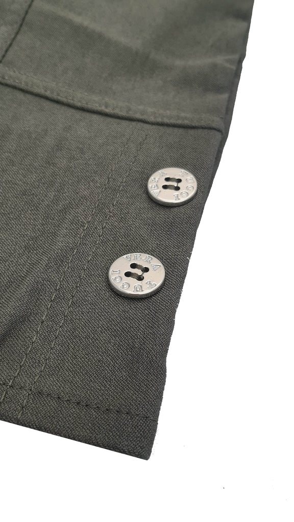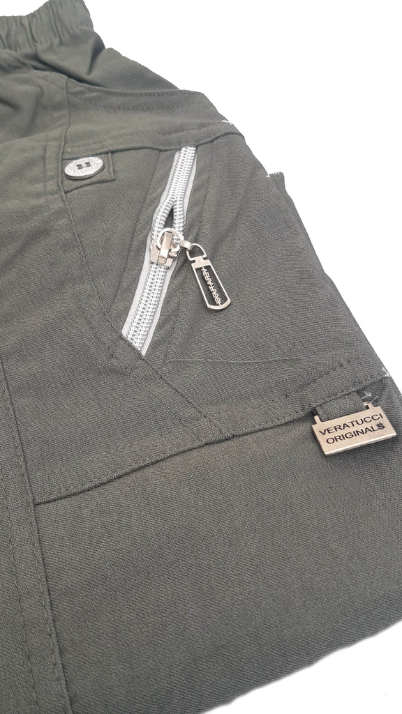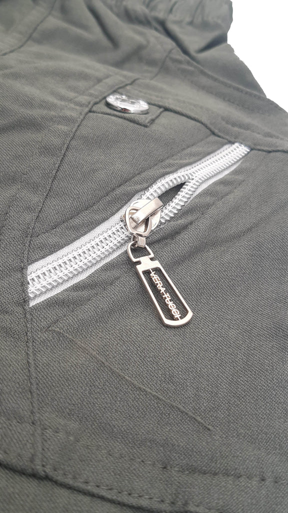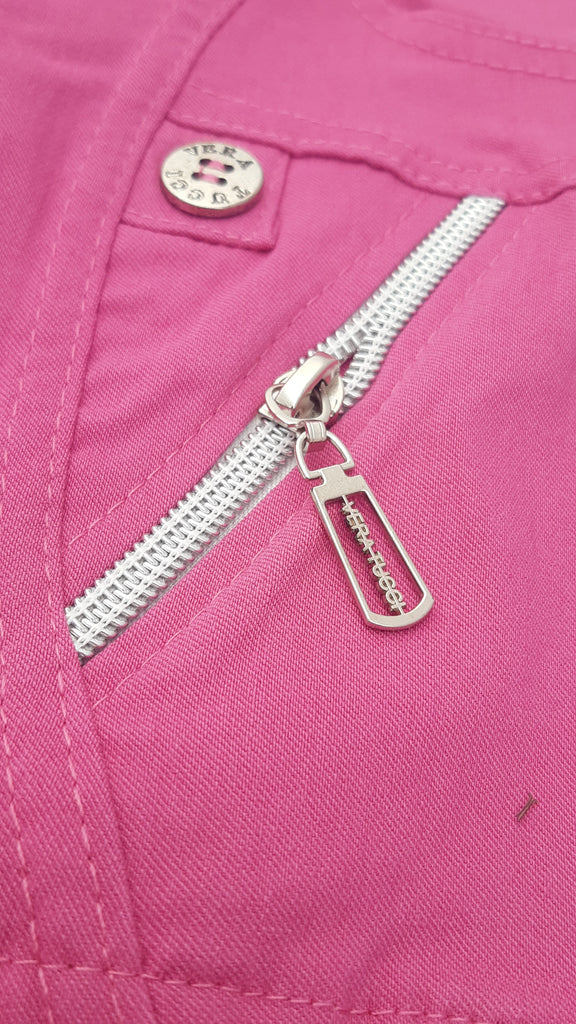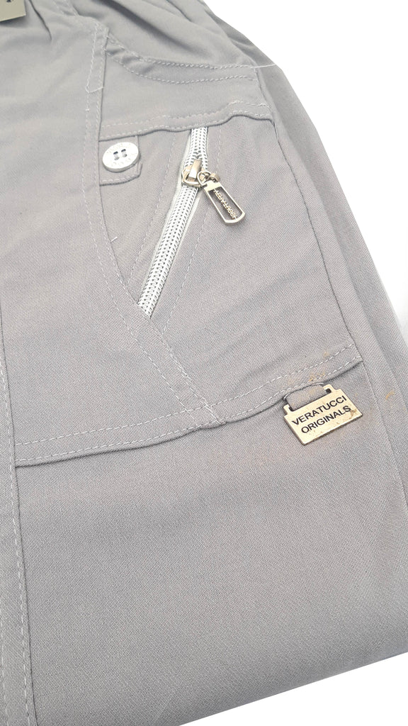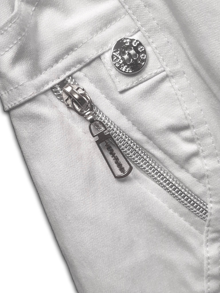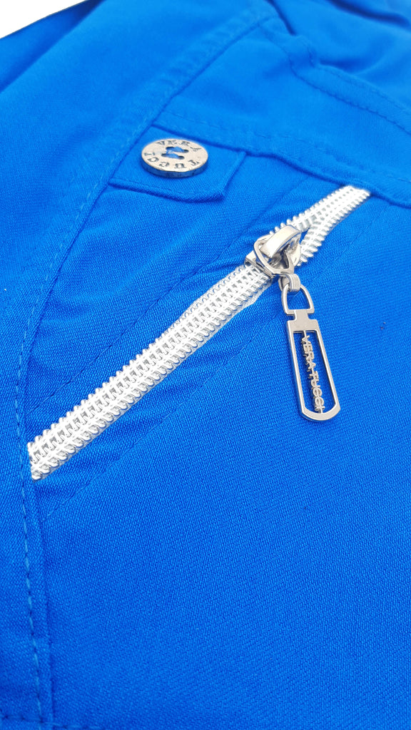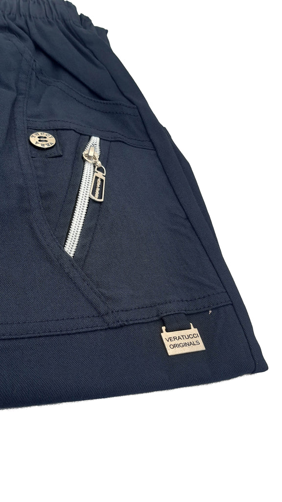 - Elastischer Bund, Reißverschlusstaschen und Knopfdetails an der Wade mit Vera Tucci-Branding