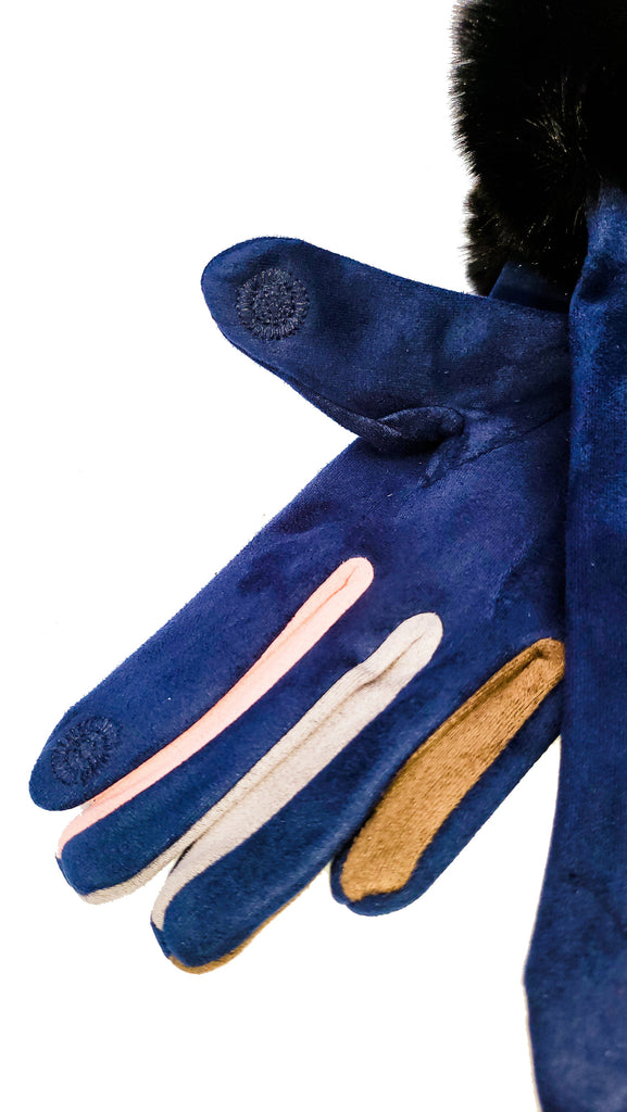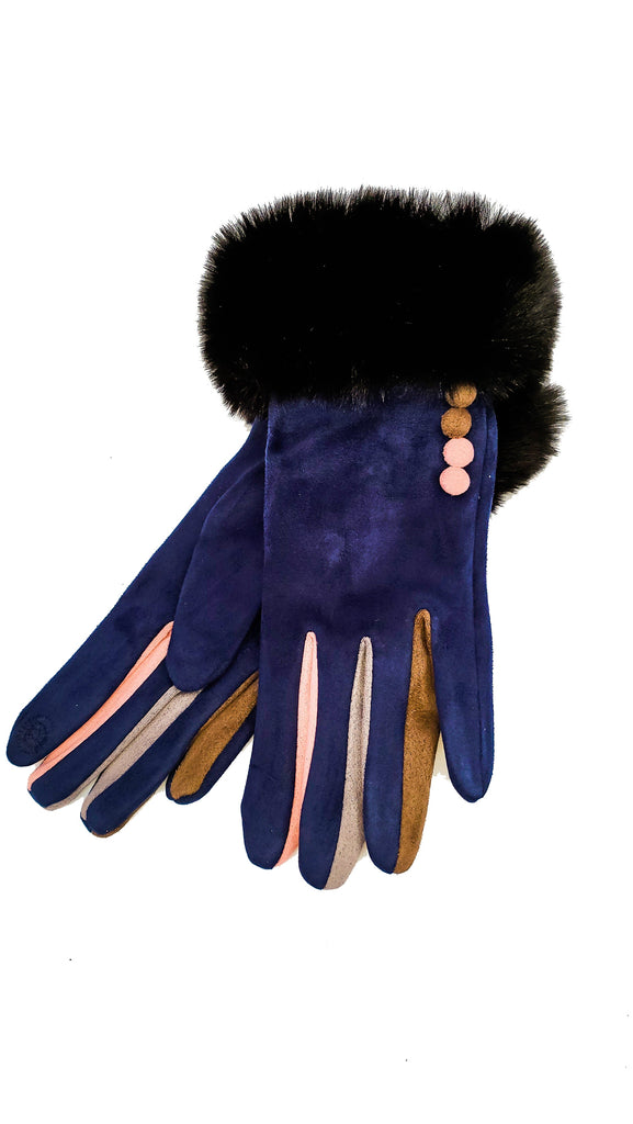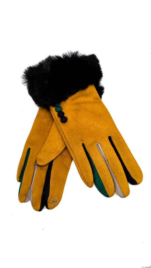 Felicity Faux Suede Fur Trim Gloves  The perfect gloves to add a bright element to your outfit, while keeping your hands warm and toasty. The matching multicoloured buttons, fluffy fur trim, and multicoloured fingers, create a unique and beautiful design. Plus, the touchscreen thumb and forefinger means you can use...